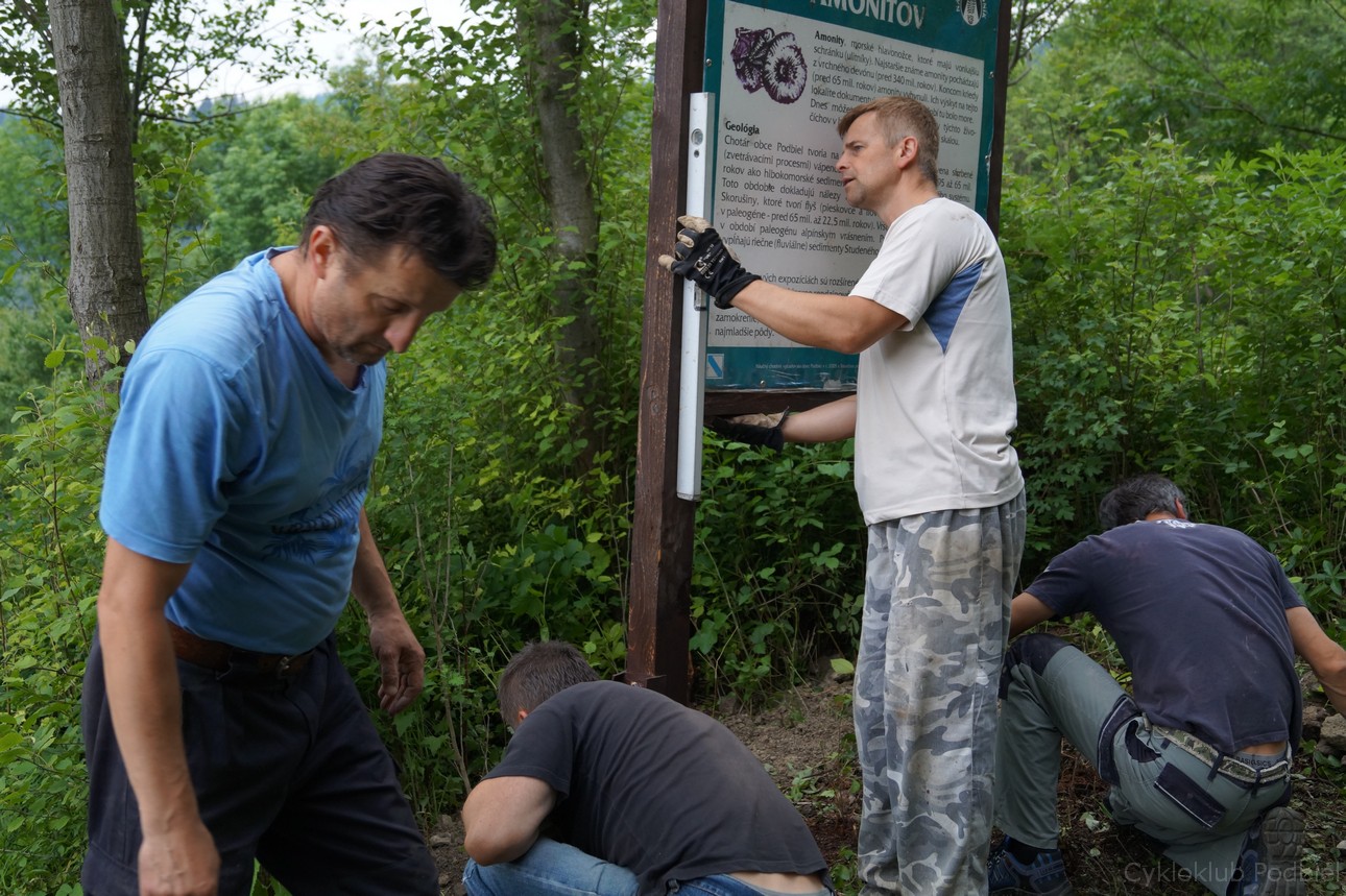 Na brigádu v lese netreba špeciálnu kvalifikáciu stačí chuť. A takúto chuť mali i Ľubko K. s Milošom K. v piatok. Rozhodli sa vyžať chodník smerom od vodopádu až k Červenej skale. Nám piatim v sobotu 27. júna 2015 Ľubkovi F., Jojovi K., Dodovi I., Pavlovi K., a Ľubke K., zostala práca opraviť a osadiť informačnú tabuľu, ktorá bola značne poškodená. Po celkovej rekonštrukcii sme rozmýšľali, kde by sme ju osadili a našli vhodnejšie miesto.